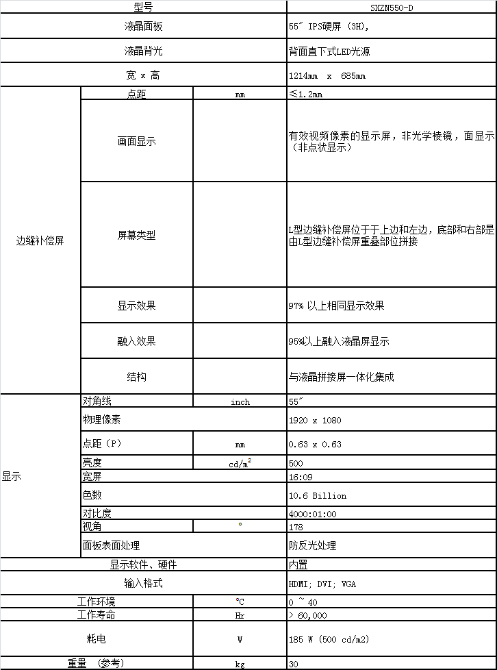 無縫液晶拼接屏SXZN550-D技術(shù)參數(shù)表: